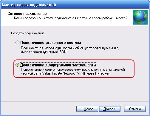 4. В окне "Сетевое подключение " выберите опцию " Подключение к виртуальной части сети". Нажмите кнопку "Далее".