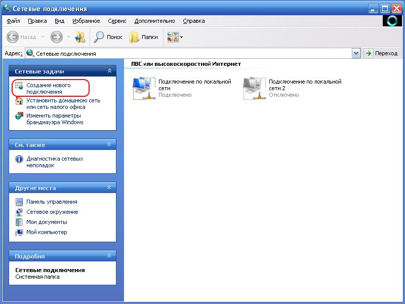2. Откройте окно сетевого окружения (дважды кликните мышкой по иконке "Сетевое окружение" на рабочем столе). Кликните по ссылке "Сеть и удаленный доступ к сети" (для Windows XP по ссылке "Отобразить сетевые подключения"). Дважды кликните по иконке "Создание нового подключения" (для Windows XP по ссылке "Создание нового подключения").