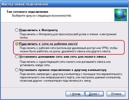 3. В первом окне Мастера новых подключений нажмите кнопку "Далее". В окне "Тип сетевого подключения" выберите опцию Подключить к сети на рабочем месте. Нажмите кнопку "Далее".