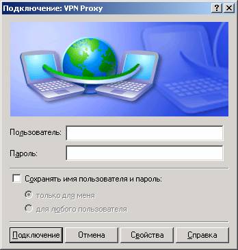 10. В появившемся окне подключения введите Имя пользователя и Пароль. В случае, если компьютером, на котором Вы производите настройку VPN-соединения, кроме Вас никто больше не пользуется, Вы можете включить галочку "Сохранить пароль". В этом случае Вам не придется вводить пароль всякий раз при установке соединения. В противном случае включать эту галочку категорически не рекомендуется!