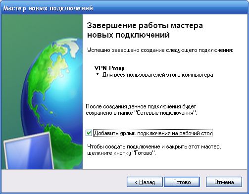 7. В окне завершения работы мастера по желанию установите галочку "Добавить ярлык подключения на рабочий стол" и нажмите кнопку "Готово".