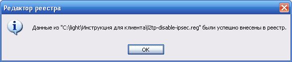 1. Скачайте файл (нажмите правой кнопкой мышки по ссылке и выберите "сохранить как") l2tp-disable-ipsec.reg, выполните его в Windows XP, появится следующий диалог (нажмите "Да"):